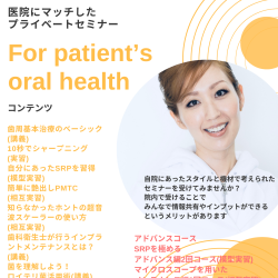 各企業やスタディーグループで歯科衛生士へのセミナー、講演などを行っております。 セミナーや講演を行う理由 海外研修へ毎年1回、1ヶ月ぐらいを利用し、その年に自身が学びたいことを決め、学んでおり ます。ヨーロッパ、アメリカで学んだ内容を自身の臨床へ生かし、その内容を自身で囲うのでは なく、シェアしたいと考えているからです。 セミナー、講演企業例 (株式会社モリタ、白水貿易、茂久田商会、ライオン歯科器材、ストローマンジャパン、デンツプ ライ三金、ノーベルバイオケア、国際歯科大会、SAFE総会、USCジャパンプログラム、OJ衛生士 セッションetc)